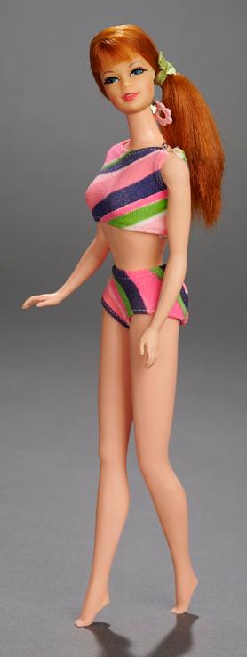 11.5” (29 cm.) Red flip hairstyle with bangs, blue eyes, freckles, coral pink lips, straight leg body with nail polish, original two-piece swimsuit in chartreuse and orange, white open toe heels in cello. Excellent condition, box has a split in corner of lid. Mattel, 1963. Includes