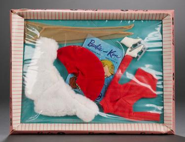 11.5” (29 cm.) Red knit body suit with velvet skirt, white faux fur jacket, stockings, and ice skates. Near mint condition, minor wear to packaging. Mattel, 1962. Presented in original unopened package with booklet.