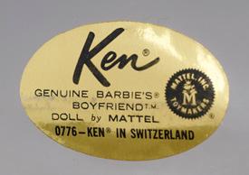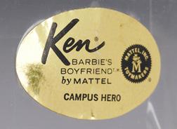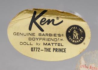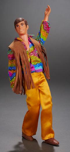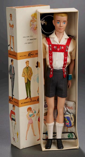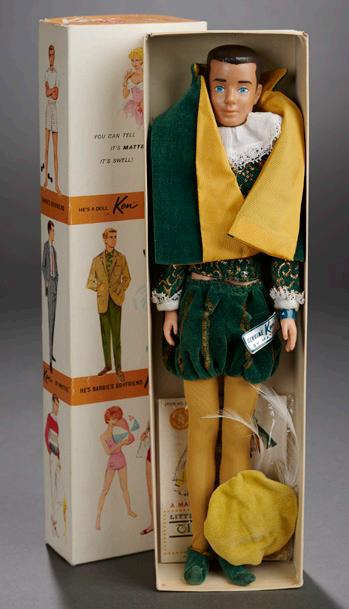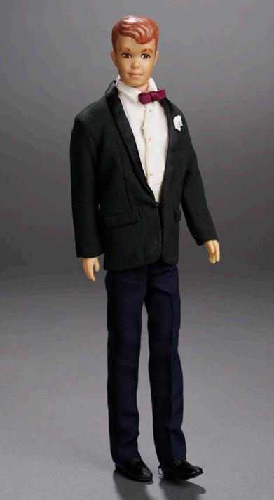 12” (30 cm.) Brunette flocked hairstyle, blue eyes, pink lips, straight leg body, wearing “Tuxedo” #787 costume with jacket, shirt, tie, cummerbund, pants, and shoes. Excellent condition. Mattel, 1961. $100/200