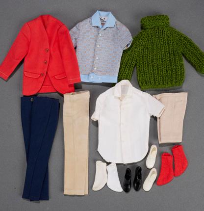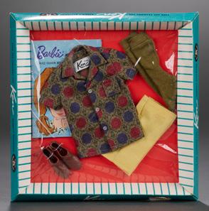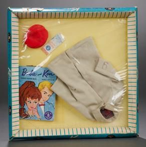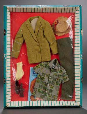 12” (30 cm.) Green blazer, print shirt, dark green pants, straw hat, socks, shoes. Near mint condition, booklet is loose in package. Mattel, 1961. Includes fashion booklet in original unopened package, one of the first costumes available for the Ken doll. $100/200