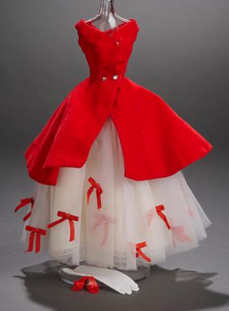 11.5” (29 cm.) Red velvet tunic with rhinestone buttons, tulle skirt with tiny red bows, long white gloves, and red open toe heels. Excellent condition. Mattel, 1966. $200/300 333.