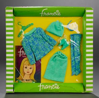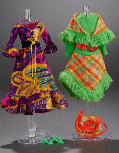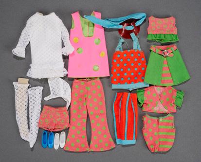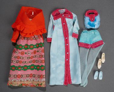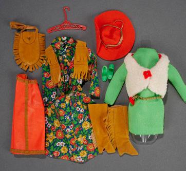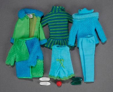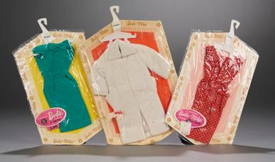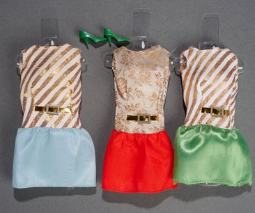 11.5” (29 cm.) Green silk sheath dress, rust colored sheath dress with polka dots, flannel coat in the style of “Peachy Fleecy.” Excellent condition, some wear to cello and one Pak is missing label. Mattel, 1962. Fabulous to find in original package. $150/200