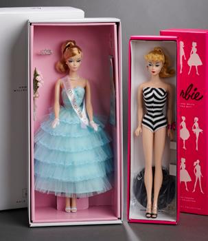 11.5” (29 cm.) “Homecoming Queen” from the Willows Wisconsin Series of Barbie collector dolls with blonde hair, crown, wearing tulle dress in original box. “Black and White Swimsuit” Barbie is a replica of early Barbie, wearing the iconic swimsuit. Excellent condition. Mattel, 2014. $200/300