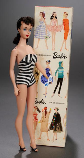 11.5” (29 cm.) Black ponytail hairstyle with soft curly bangs, arched dark eyebrows, black and white painted sideglancing eyes, red full lips, solid torso body with painted nail polish, holes in feet lined with metal tubes to accommodate posing stand, black and white swimsuit, sunglasses, black open toe heels with holes for posing stand. Excellent condition, stains at feet from shoes, minor wear to box. Mattel, 1959. Presented in original box with booklet, neck liner, ankle brace (although torn), and original two prong posing stand marked “Brunette.” A fabulous example of the early