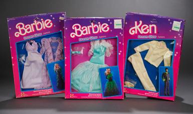 11.5” (29 cm.) Collection of Dream Glow fashions including: nightgown and robe #2192, suit for Ken doll #2193, and blue evening gown #2190. Excellent condition, some wear to package. Mattel, 1985. Each has a glow in the dark feature. $100/200