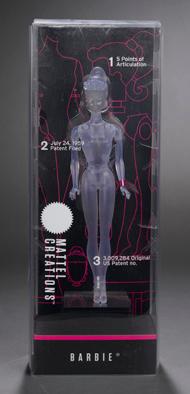11.5” (29 cm.) Clear/translucent Barbie doll produced as an art piece by Mattel showcasing the actual engineering of the doll. Excellent condition. Mattel, 2020. Presented in original shipper. $300/400