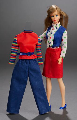 11.5” (29 cm.) Ash blonde long straight hair with bangs, blue eyes with rooted lashes, blush, rose pink lips, twist ‘n turn body with bendable legs, wearing 1973 “Get Ups ‘n Go United Airlines Stewardess” #7703 costume with tricot polka dotted blouse, blue vest, red cotton skirt. Also includes striped turtleneck, belt, and pants for variation uniform. Excellent condition. Mattel, doll is 1967, costume is 1973. Based on the actual uniforms designed by Hollywood designer, Jean Louis. $200/300