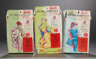 11.5” (29 cm.) Three Sew Free costumes for Barbie doll featuring printed fabric panels to cut and use “sew free” glue strips to assemble. Contents are near mint condition, although packaging has some wear. Mattel, 1965. Each is unused with original instructions and glue strips in original box. $100/200