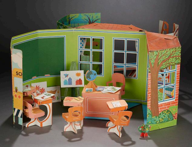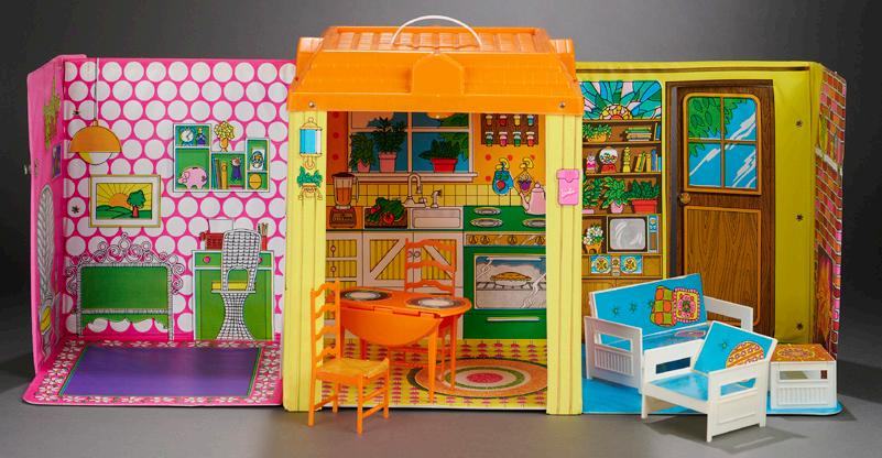 12” (30 cm.) Vinyl structure for Barbie with hard plastic orange roof that folds out into three rooms, living room, kitchen, and bedroom. Includes sofa, chair, end table, dining table with two chairs, and bed. Excellent condition, some cracks in roof. Mattel, 1971. Vivid and bright playset perfect for displaying Mod Dolls. $100/200