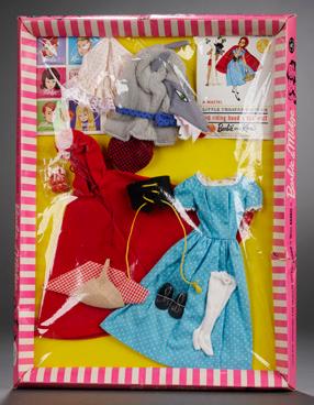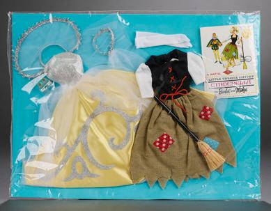 11.5” (29 cm.) Red flannel cape, dotted blue dress, dirndl, socks, slippers, basket, wax rolls, wolf mask, bonnet, hat, and pamphlet. Near mint condition, package has some wear. Mattel, 1964. Presented in original unopened package with booklet. $200/300