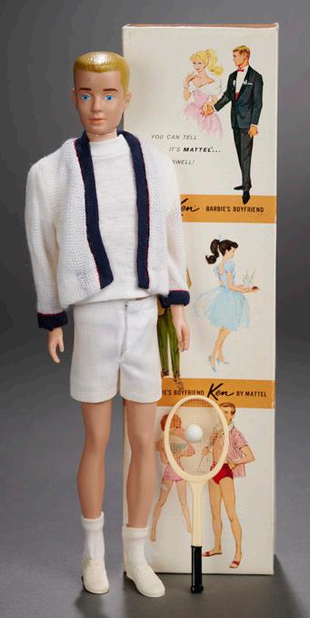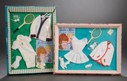 #790 costume with white shirt, shorts, cardigan, socks, and shoes, with racket and ball. Excellent condition. Mattel, 1964. In original box with gold bands and black wire posing stand. $300/400