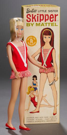 12” (30 cm.) Blonde flocked hair with brown eyebrows, blue eyes, pale pink lips, straight leg body with red swimsuit, cord sandals. Excellent condition, minor wear to box. Mattel, 1961. Includes posing stand, in original box with booklet and neck brace liner. $100/200