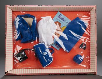 Two-piece dark blue uniform with matching hat, shoes, white blouse, black vinyl purse, and American Airlines logo overnight bag. Near mint condition, some wear to package. Mattel, 1961. Presented in original unopened package with booklet. $300/400