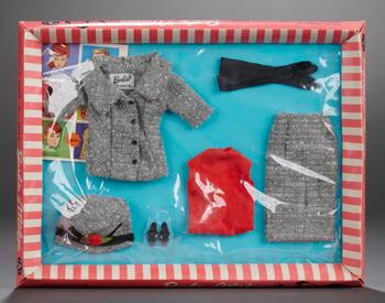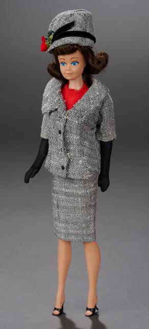 11.5” (29 cm.) Salt ‘n Pepper tweed two-piece suit with matching hat, red knit blouse, black tricot long gloves, and black open toe heels. Near mint condition, minor package wear. Mattel, 1963. Presented in original unopened package with booklet. $200/300