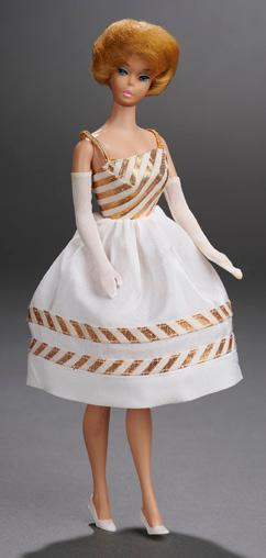 silk chiffon sash, long white gloves, gold dimpled purse, white closed toe pumps. Near mint condition. Mattel, 1965. Presented in original unopened package with booklet, includes circular label marked “#1639 Holiday Dance” on end of box. $300/400