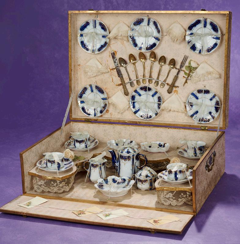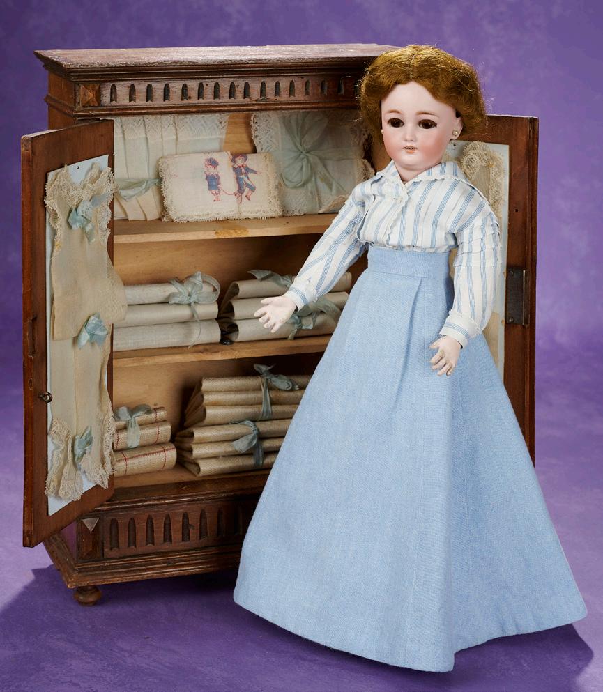secretaire-chest with locks and key, drop-front desk surface to reveal fitted interior; and bed with carved crest on headboard and original mattress and pillows (also blue silk bed covers). Excellent condition. French, circa 1860, the quality of the set suggests its original presentation in luxury store such as Maison Giroux or Au Paradis des Enfants. $1200/1600