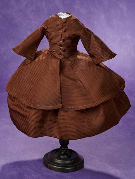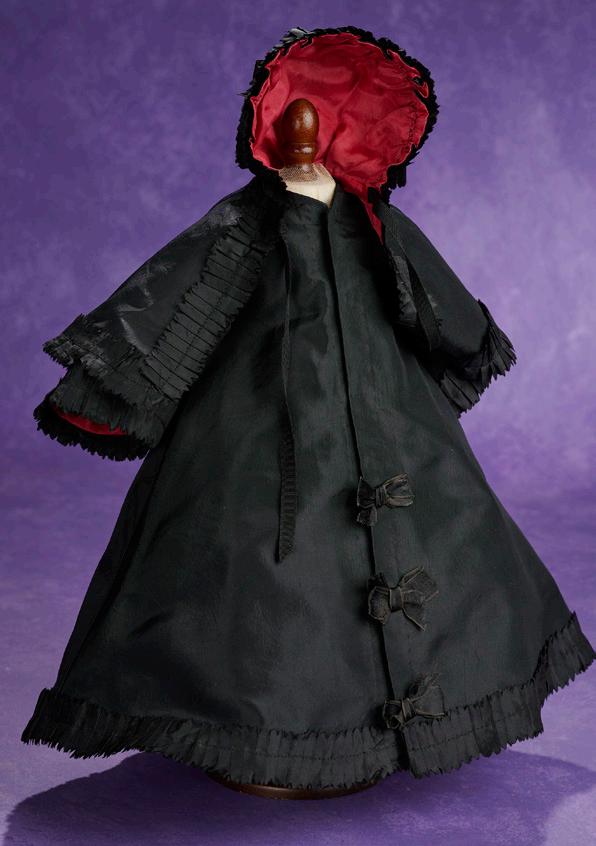 4” shoulders. 11” overall length. For 16”-17” poupée. The two-piece ensemble of black velvet, with gauze and silk lining, has dainty short pagoda style sleeves and is decorated with bands of geometrically-arranged black glass beading, and with fringed edging on sleeves. Excellent condition. French, circa 1860. $500/700
