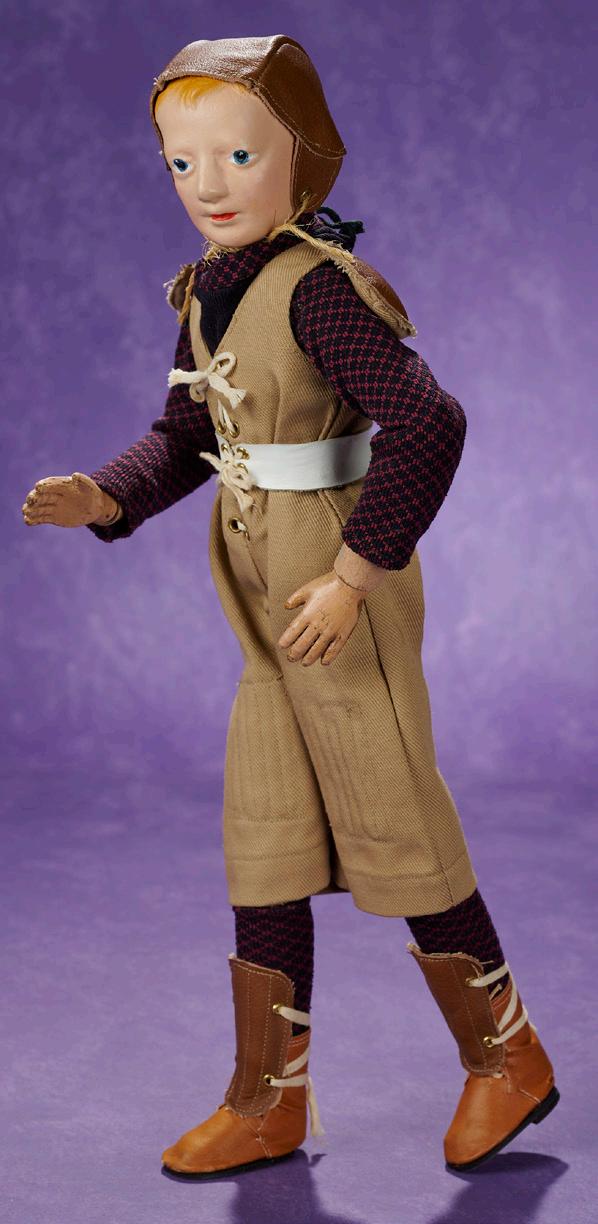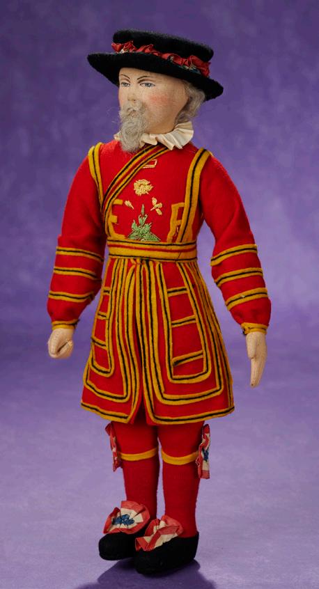15” (38 cm.) Firmly-pressed muslin doll with painted facial features, white mohair wig and beard, stitched-on felt costume depicting the uniform of the Yeoman of the Guard. Condition: generally excellent. Comments: Liberty of London, 1930s, included with the doll are 1936 letters from the US Embassy and Hamley’s store of London, concerning the search to acquire this doll. Value Points: vibrant original colors are well maintained. $400/500