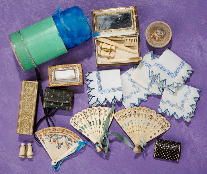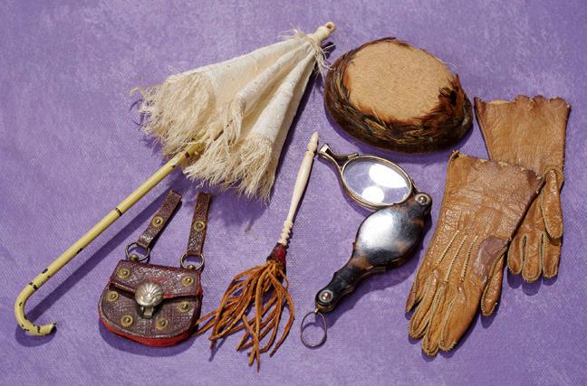 The elegant accessories include black velvet hat (1 ¾” inside diameter) with ivory silk lining, pleated black silk border, black velvet tie strings and extended length embroidered black lace lappets; 2” kidskin gloves; 4” black woolen fringed blanket wrap in original leather straps; 2 ½” padded feather muff with neck cord; 2 ½” lacquer cover dance book with mother of pearl inlay and pencil; and red leather card case with embossed gold design of Exhibition building, containing playing cards. Excellent condition. French, circa 1880. $600/800
