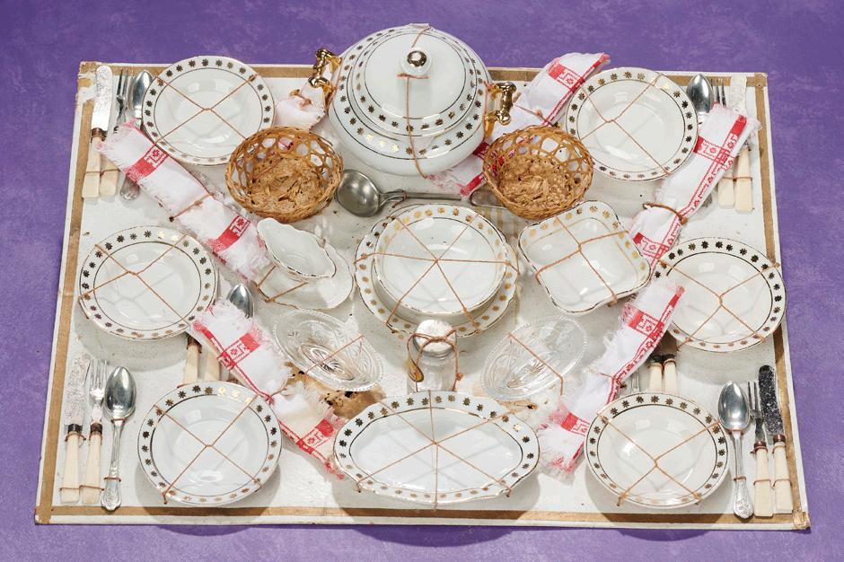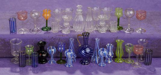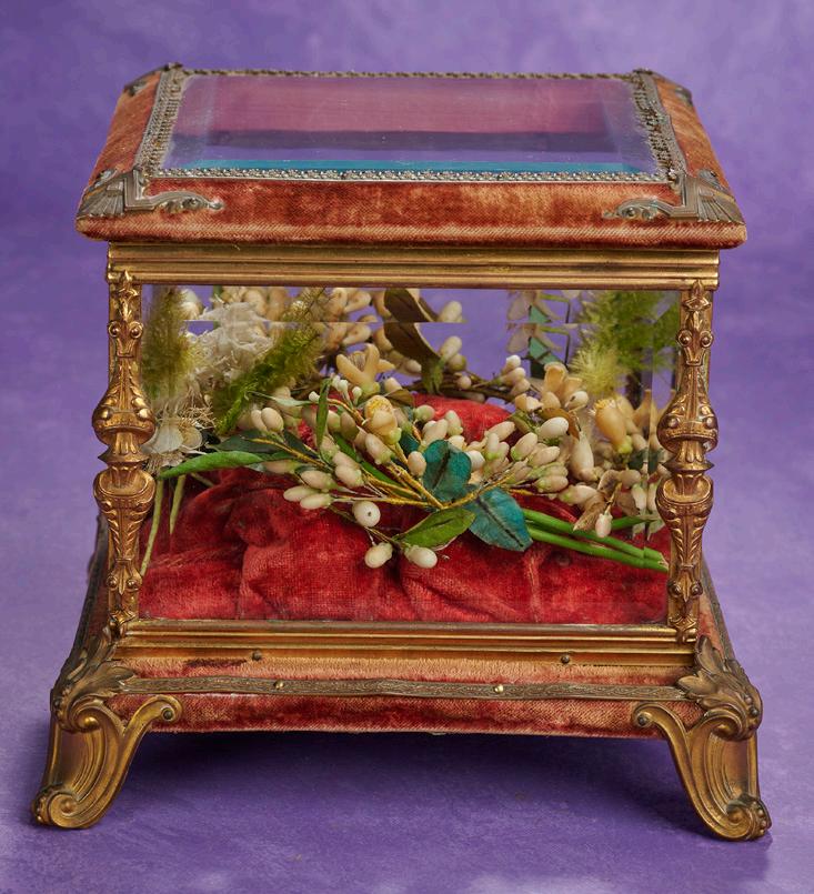 original costume of the 1920 era. The ladies are presented seated on wooden chairs with matching marble top table, and are preserved under glass dome on ebony base. Excellent condition. Germany, Galluba & Hoffman, circa 1915, in an early catalog the firm described the trio as “fashion dolls, with the use of Empire furniture...arranged for 5 o’clock tea”. The extremely rare set is presented in impeccably preserved condition. $3500/4500