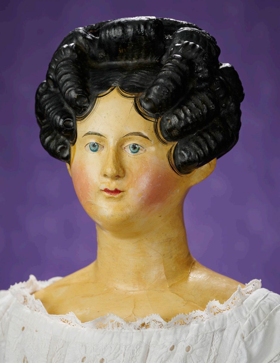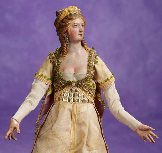 26” (66 cm.) Bisque swivel head on kid-edged bisque shoulderplate, blue glass paperweight eyes with spiral threading and darker blue iris rims, dark eyeliner, mauve blushed eye shadow, painted lashes and feathered brows, black beauty spot, accented eye corners and nostrils, closed mouth with accent line between the lips, pierced ears, brunette human hair in elaborate upswept coiffure over cork pate, French kid poupée body with gusset jointing at hips and elbows, wooden arms with dowel jointing at shoulders and elbows. Condition: generally excellent, sturdy original body. Comments: Emile Jumeau, circa 1875. Value Points: finest clarity and quality of bisque with delicate complexion, softly blushed cheeks and chin, and wearing extravagant ball gown with jewels and gala mask.