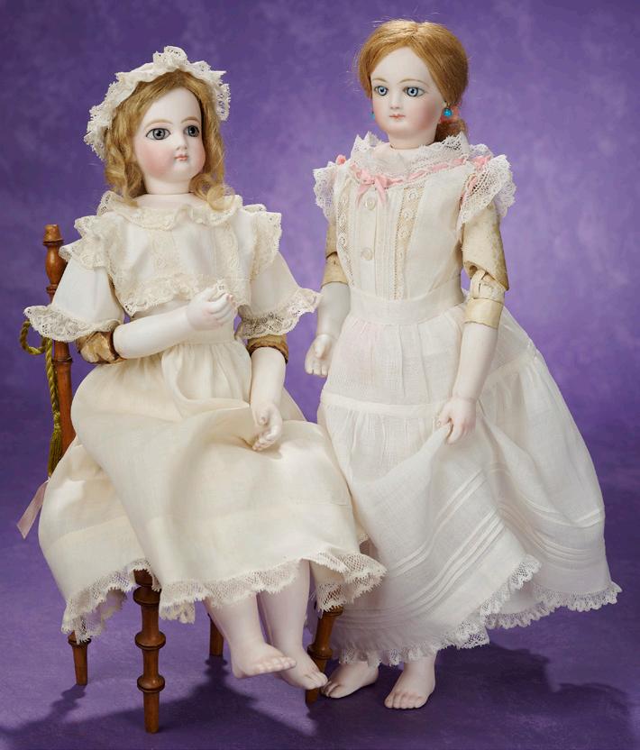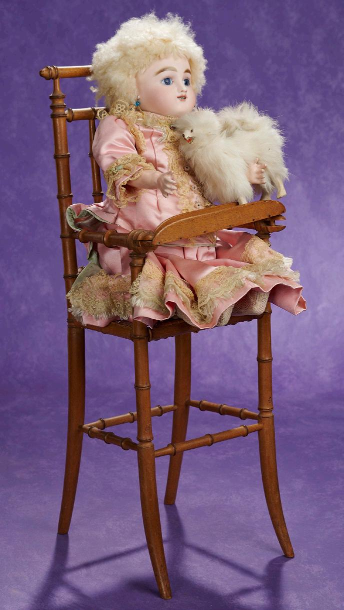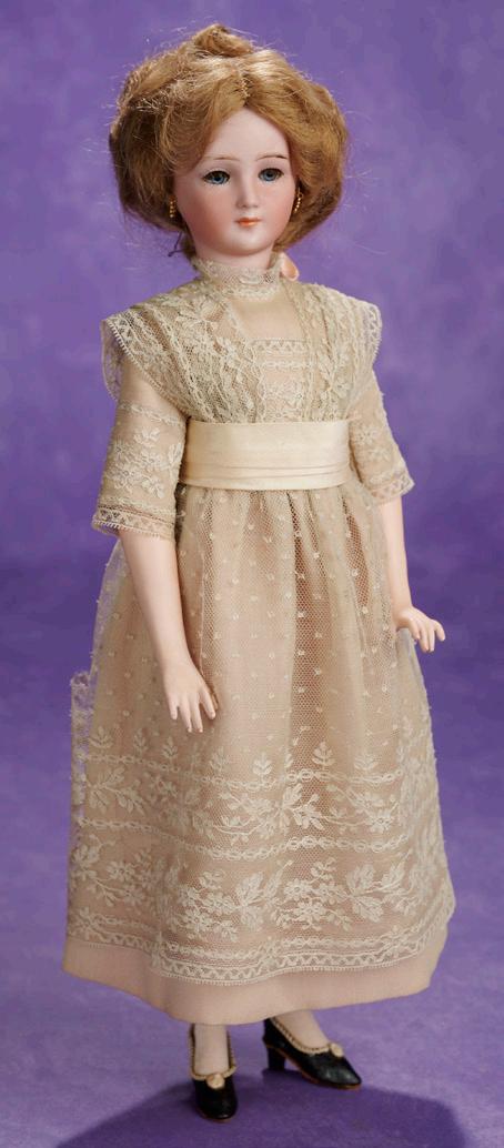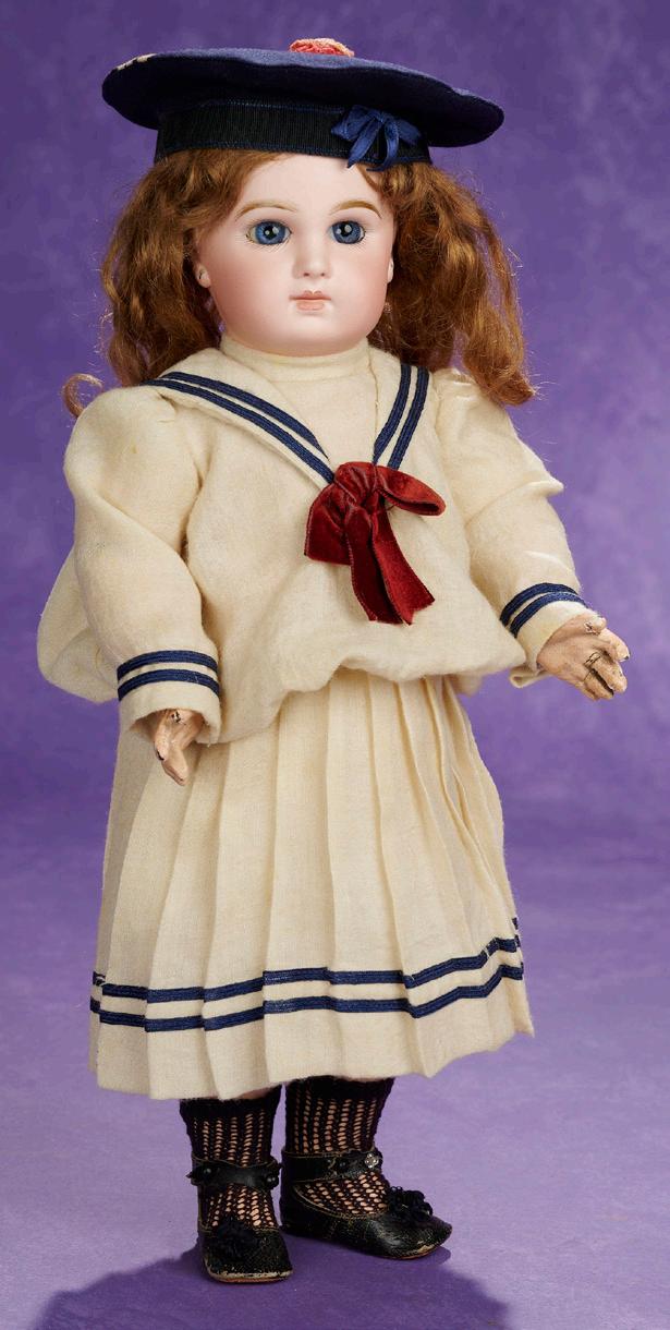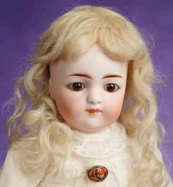 15” (38 cm.) Bisque swivel head on kid-edged bisque shoulderplate, small cobalt blue inset eyes, dark eyeliner, delicately-painted lashes and brows, accented nostrils and eye corners, closed mouth with center accent line between pale lips, ears pierced into head, blonde mohair wig