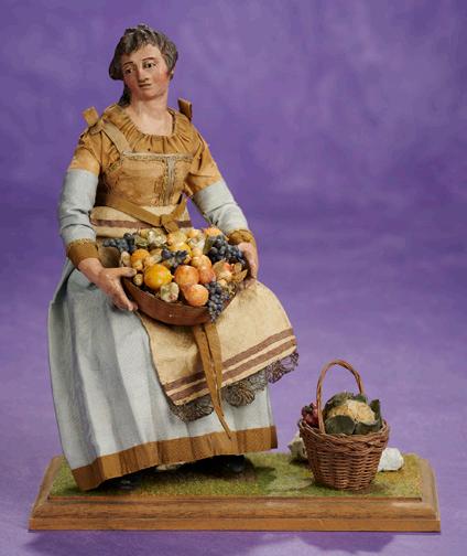 4 ½” (11 cm.) The artistically-modeled dog in reclining pose with curled tail and extended front paws has tiny inset enamel eyes and sculpted brown collar. Excellent condition. Italian, early 1800s, from Neopolitan scenes of villages and aristocratic homes. $400/500