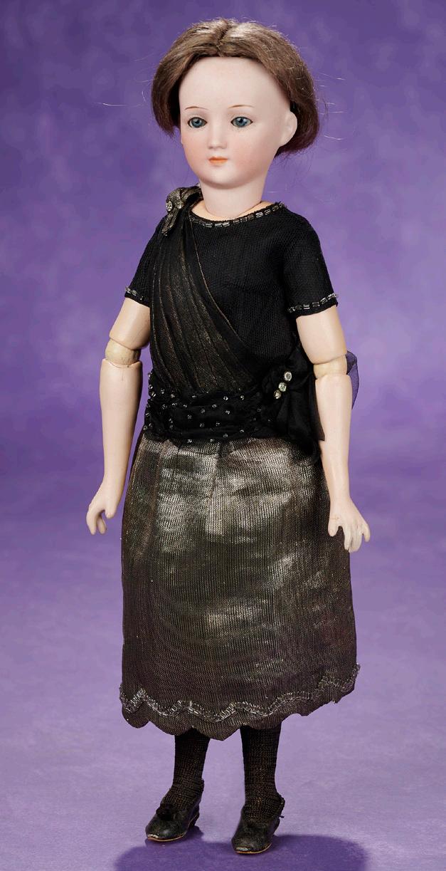 14” (36 cm.) Bisque socket head with heart-shaped face, small blue glass sleep eyes, painted lashes and delicately-feathered brows, accented nostrils, closed mouth with center accent line, pierced ears, brunette mohair wig in long flowing curls, composition and wooden fully-jointed body with slender and elongated torso and limbs, feet posed for high heels. Condition: generally excellent. Marks: 1469 Simon & Halbig 2. Comments: Simon and Halbig, circa 1915. Value Points: the sought-after model of slender-bodied Edwardian fashion lady has wonderful bisque and expression, original body and body finish, and lovely antique costume. $1800/2200