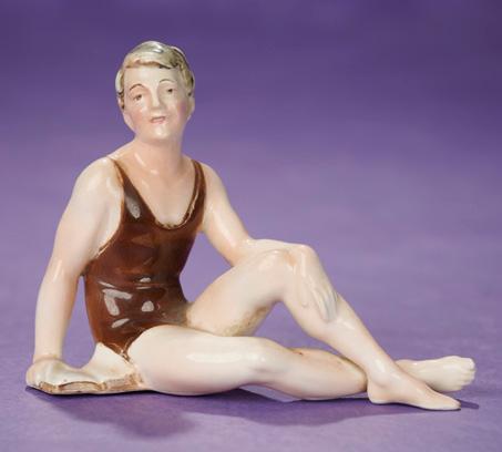 Each is all-bisque figure of nude woman with painted facial features and mohair wig, painted pink or white slippers with ankle straps, including 6” lady lying on her stomach with upheld head and with net swimsuit; 4” seated woman with head turned to the side, hand held to face and body supported by her extended left hand; 6 ½” lady lying on her side with head lifted and supported by her hand; and 6” lady lying on side with right leg flirtatiously in air and clasped by her extended right arm. Excellent condition. Germany, circa 1915. $800/1100