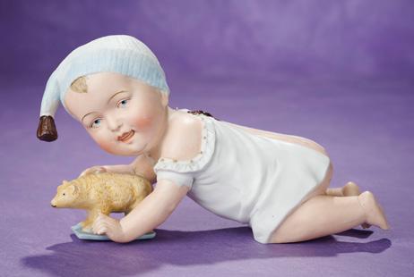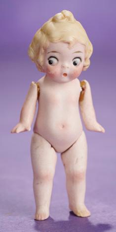 Each is one-piece all-bisque figure of nude adult woman with painted facial features and mohair wig, posed in flirtatious manner, including 3” petite lady posed on stomach with extended arms, lying on bear carpet; 5 ¼” lady lying on her side with upheld head, clasping a fan to her face, blue heeled shoes; and 6” lady lying on her back with arms folded behind her head, right leg extended over bent left knee. Excellent condition. Germany, circa 1915. $700/900