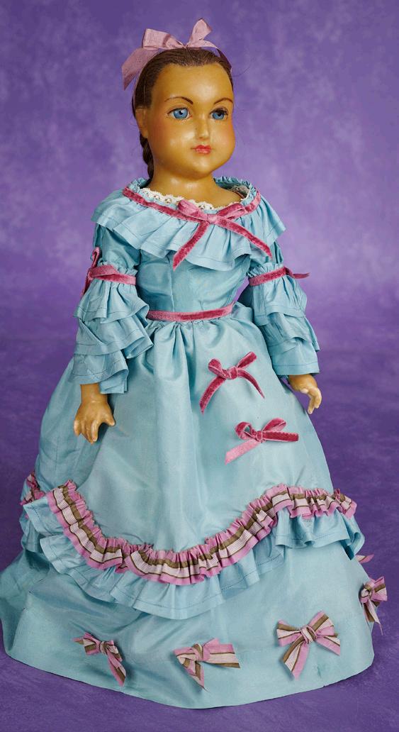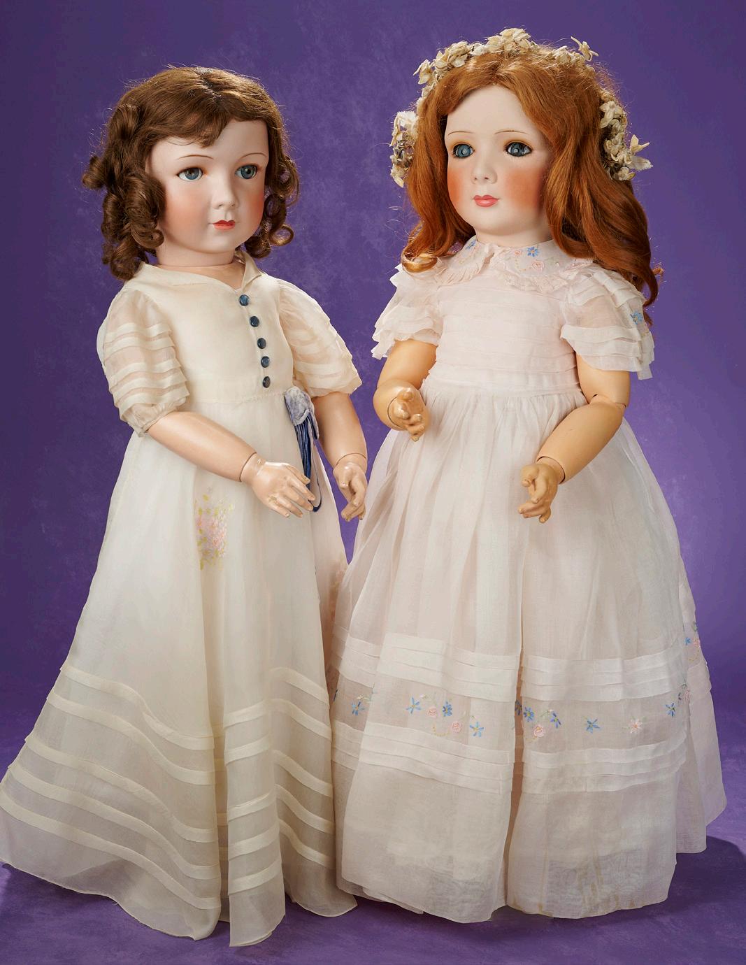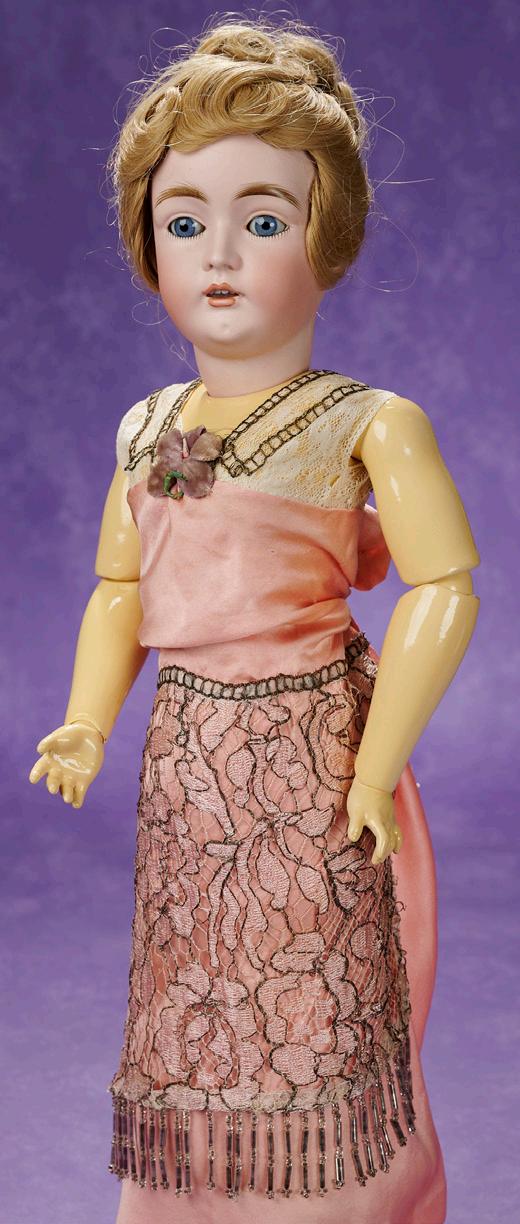 19” (48 cm.) Bisque socket head, blue glass sleep eyes, painted lashes, brushstroked brows, accented nostrils and eye corners, four porcelain teeth, blonde human hair wig in elaborate coiffure, composition and wooden ball-jointed lady-shaped body with modeled bosom and tiny waist, silk flapper era dress. Condition: generally excellent. Marks: F made in Germany 10 162 (head) Germany (body). Comments: Kestner, circa 1900. Value Points: especially fine modeling including deep chin dimple, original lady body and body finish, with original store label for G.A. Schwarz of Philadelphia. $1100/1300