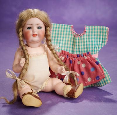 22” (58 cm.) Bisque socket head, blue glass sleep eyes, dark eyeliner, painted lashes, short feathered brows, accented nostrils, closed mouth with shaded lips, brunette mohair wig, composition and wooden balljointed body, nicely costumed. Condition: generally excellent. Marks: K*R Simon & Halbig 117 58. Comments: Kammer and Reinhardt, circa 1912, the model “Mein Susser Liebling” (my sweet darling) from the firm’s character series. Value Points: wellmodeled details are enhanced by finest gleaming complexion, original body and body finish. $1800/2100