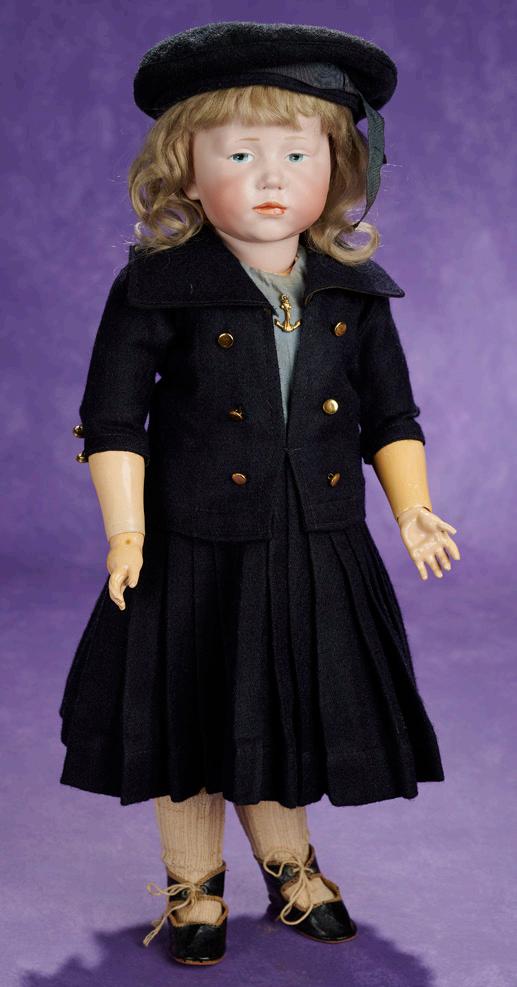 22” (57 cm.) Bisque socket head, painted blue eyes with glaze highlights, thick black upper eyeliner, one-stroke tapered brows, accented nostrils, closed mouth with very full shaded and outlined lips, blonde mohair wig, composition and wooden balljointed body. Condition: generally excellent, few typical wig pulls at back of head. Marks: K*R 114 57. Comments: Kammer and Reinhardt, circa 1910, “Gretchen”, from the firm’s art character series. Value Points: very fine quality of bisque and painting enhances the deeply modeled wistful expression, original body and body finish, original