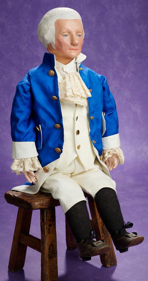 features to depict President George Washington, having blue painted eyes with heavy eyelids, single-stroke brows, aquiline nose, closed mouth with strong lips and jaw, impasto thickly-painted white hair that forms into a pony tail at the nape, cotton sateen body cover, stitch-jointed arms and legs, oil-painted hands and feet with defined fingers and toes, wearing a blue and ivory suit with lace jabot and cuffs, black stockings and shoes. Condition: generally excellent. Comments: Martha Chase, late 19th century. Value Points: very rare doll in perfectly preserved original condition with most artistic painting, the facial model unique for this doll. $1200/1700