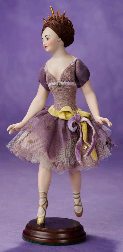 Each is all-bisque with sculpted hair and painted facial features, including 3” seated lady with bent knees, 5” lady reclining on her side holding a bird in her extended right hand; 4” lady reclining on her stomach with upheld legs, a book held in her arms; and 5” lady reclining on her side, holding a mirror in her left hand. Excellent condition. Germany, circa 1930. $500/600