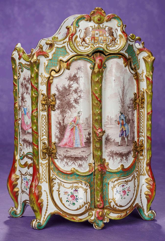 10” (25 cm.) Of fine faience with creamy background that is richly decorated with gilt and floral spray decorations, the bombe-shaped cabinet has hinged front door which opens to shelved interior which is also hand-painted and decorated; the cabinet features pastoral scenes of romantic couples in dancing poses on the top, sides and front door. French, late 1800s. Excellent condition.