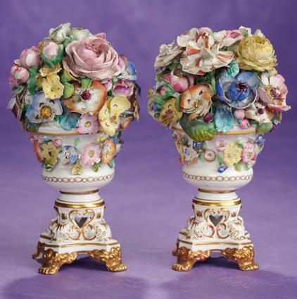 6” (15 cm.) The matching pair of porcelain urns with pedestal bases and gilded claw feet are decorated with a band of flowers around the sides of urn and filled with a lavish bouquet of variegated vibrant garden flowers of Dresden porcelain. Excellent condition with few typical flakes to Dresden petals. Germany, mid1800s. $400/500