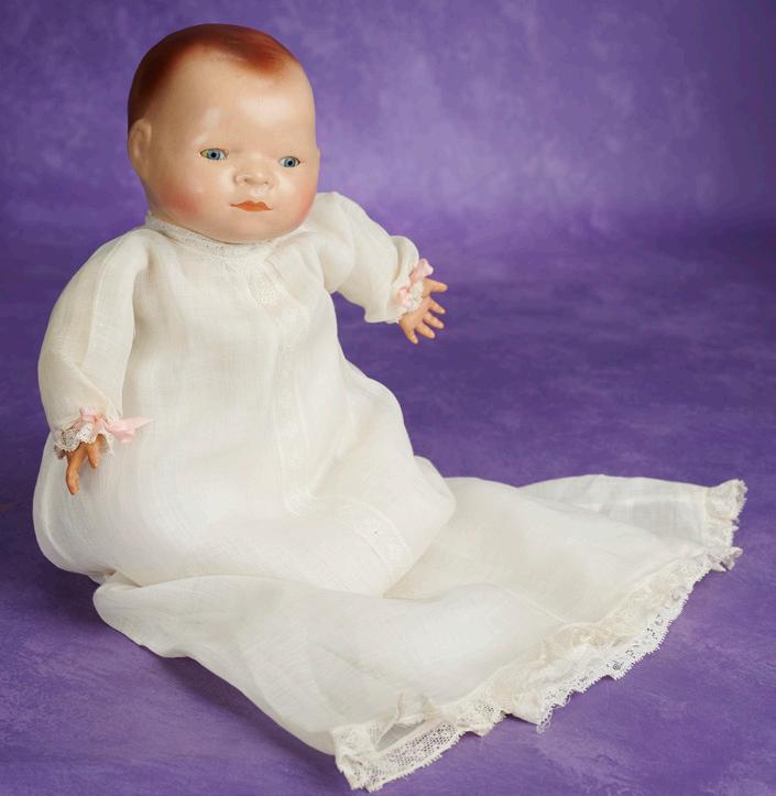 11” (28 cm.) Solid domed bisque socket head, blonde brushstroked baby hair, painted facial features, small blue painted eyes with black upper eyeliner, feathered brows, closed mouth with shaded lips, composition five-piece baby body. Condition: generally excellent. Marks: C.P. 201 23 (doll and box label). Comments: Catterfelder Puppenfabrick, from their 200 art character series introduced in 1910. Value Points: rare to find model, outstanding facial modeling including dimples and laughter lines, original body and body finish. $400/600