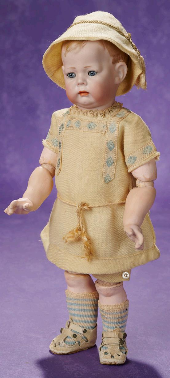 11” (28 cm.) Painted bisque socket head, blue glass sleep and side-glancing eyes, painted short lashes, tiny one-stroke brows, closed mouth with tiny bowshaped lips, blonde mohair wig, composition body with jointing at shoulders and hips, modeled bent right elbow. Condition: generally excellent. Marks: Just Me Registered Germany A 310/3/0 M. Comments: Marseille, circa 1925. Value Points: delightful shy-faced imp made for the American market, with original unique body and costume, original finish on face is well-preserved. $500/700