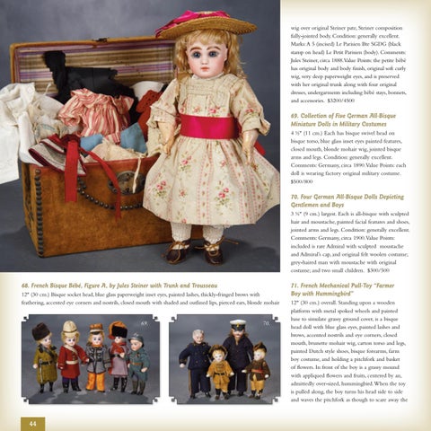 68. French Bisque Bébé, Figure A, by Jules Steiner with Trunk and Trousseau 12" (30 cm.) Bisque socket head, blue glass paperweight inset eyes, painted lashes, thickly-fringed brows with feathering, accented eye corners and nostrils, closed mouth with shaded and outlined lips, pierced ears, blonde mohair 69.