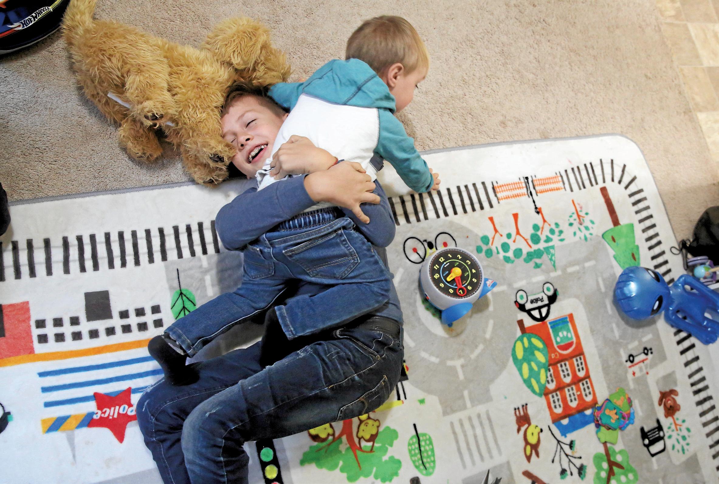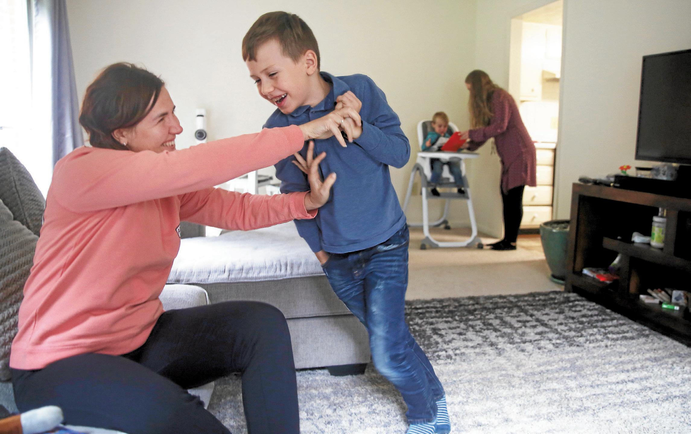 Egor and Emmett wrestle in the playroom as Jenya cooks pancakes for an evening snack.Anna arrives home from work Travis sleeps upstairs after traveling for work