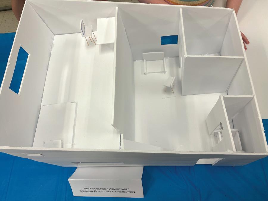 From blueprint to model, Stage IV students took on a Tiny House project full of a wide range of learning opportunities for creativity, teamwork, problem-solving, decision-making, and managing a long-term project Teams of students chose from a variety of diverse clients — a retired couple who own a dog and have a fixed income, a single parent with two kids on a budget, and a differently abled person, among others — to collaborate on designing homes They needed to learn about area and perimeter and consider what spatial awareness is and how space and measurement affect design Michael Prentis, retired architect, visited and talked with students about the process of going from a 2D plan to a 3D model, making revisions as they went along