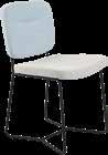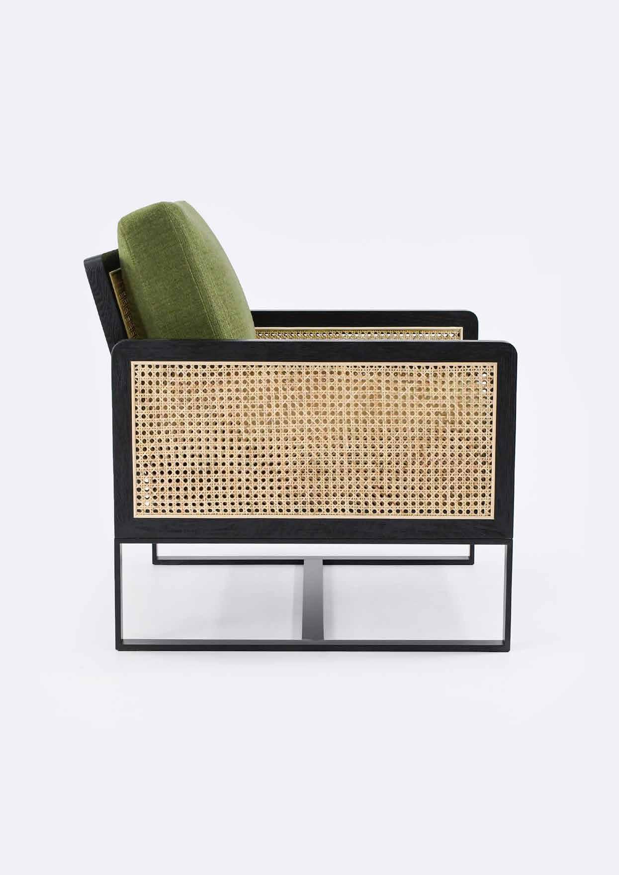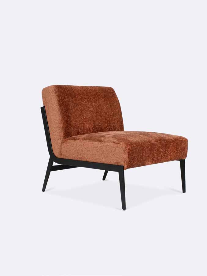 Fully upholstered occasional chair in chenille velvet with black metal frame.