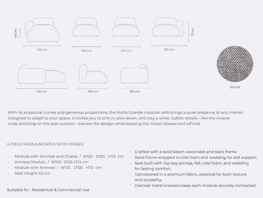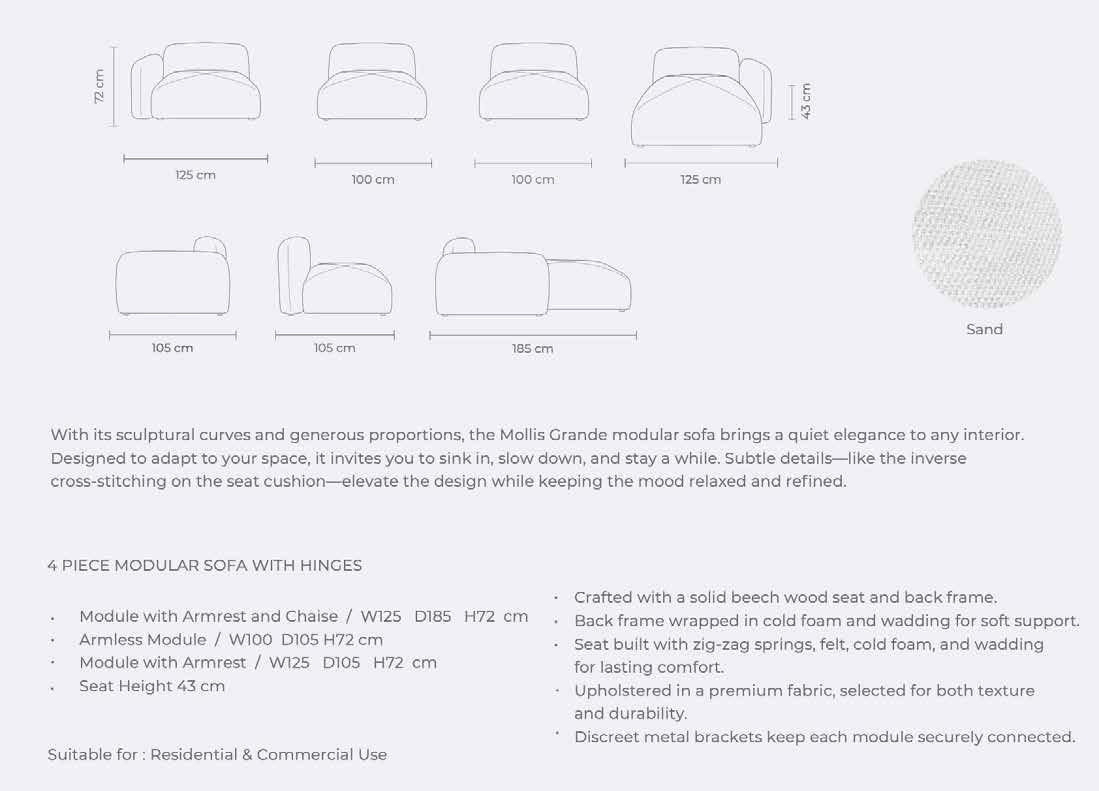 Designed for both comfort and style, it offers various configurations — a modular sofa, separate sofas with sofa coffee table, or a spacious inline layout. Upholstered in a premium textured fabric, this sofa combines contemporary European design with quality craftsmanship, making it a sophisticated centerpiece for any living space.