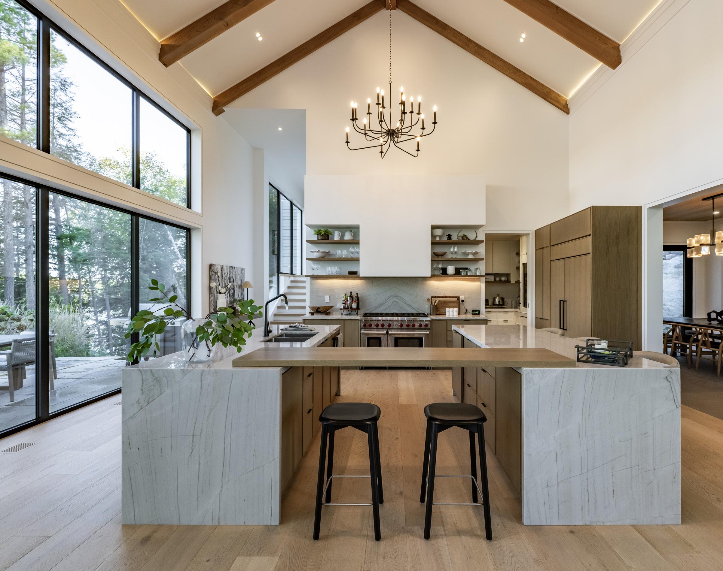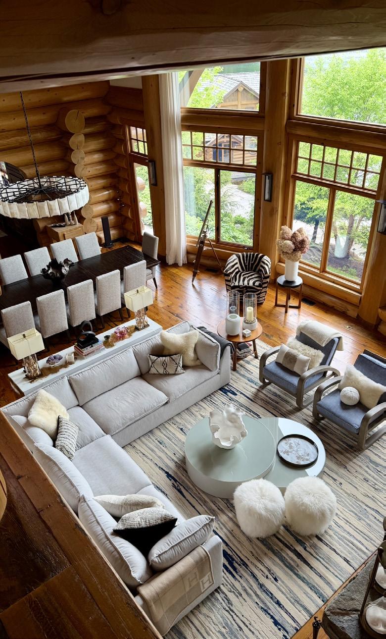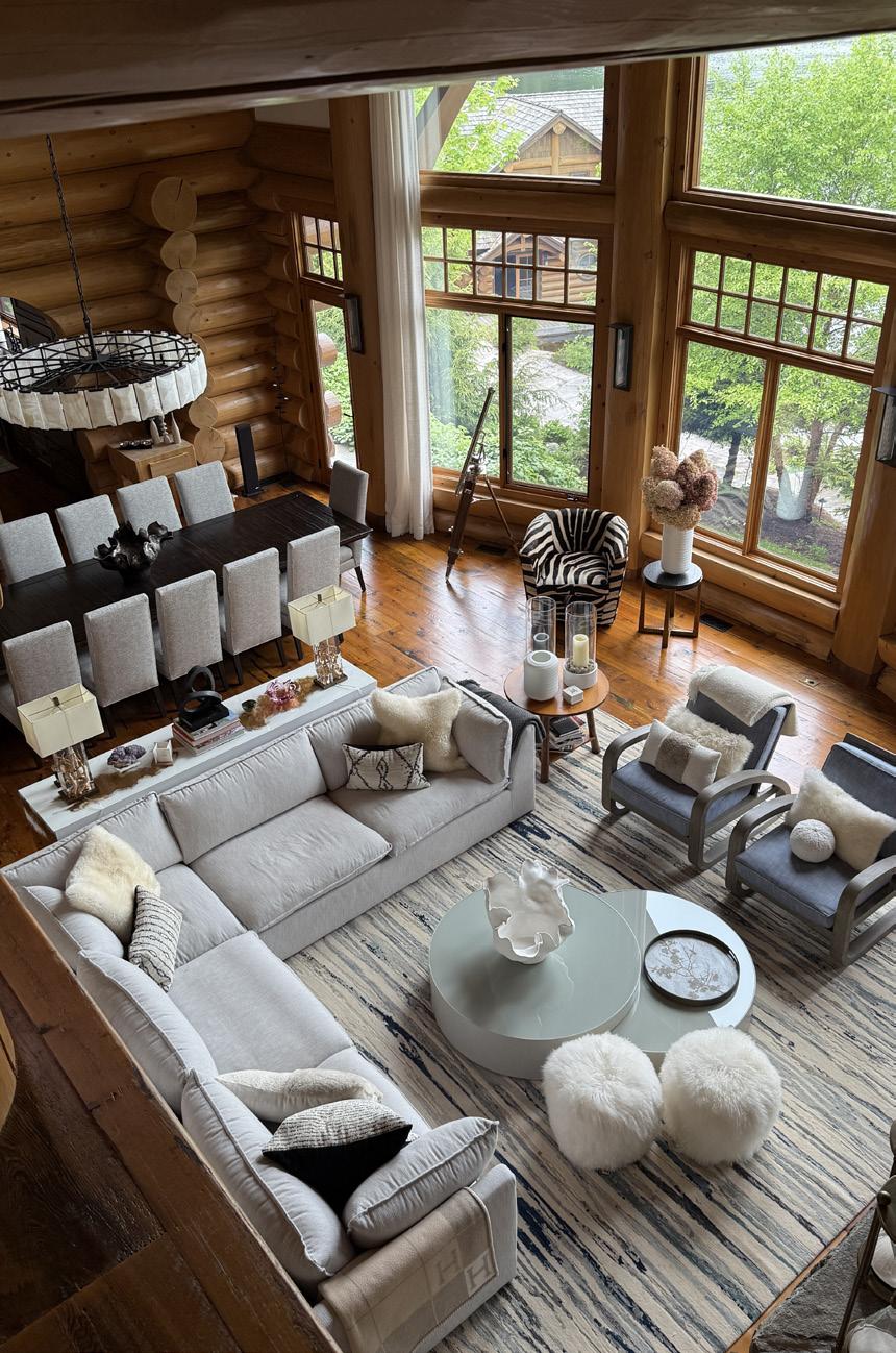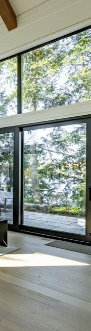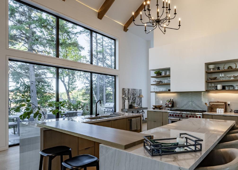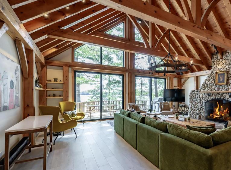 and modern yet classical in the best way possible. Hermes blankets drape carefully over the large sectional sofa, and chic coffee table books are neatly piled on solid wood furniture. Through floor to ceiling windows, we spy glistening water through breaks in the trees. This is our first taste of cottage life and it’s already so sweet. Our home for the Muskoka cottage experience was Santosha, a fivebedroom property that demonstrates what sets Muskoka cottages apart. Every detail felt considered, from the well-equipped kitchen to the expansive great room with wooden beams overhead, a huge stone fireplace and a tranquil decked patio with picnic benches to help you switch off from city life.