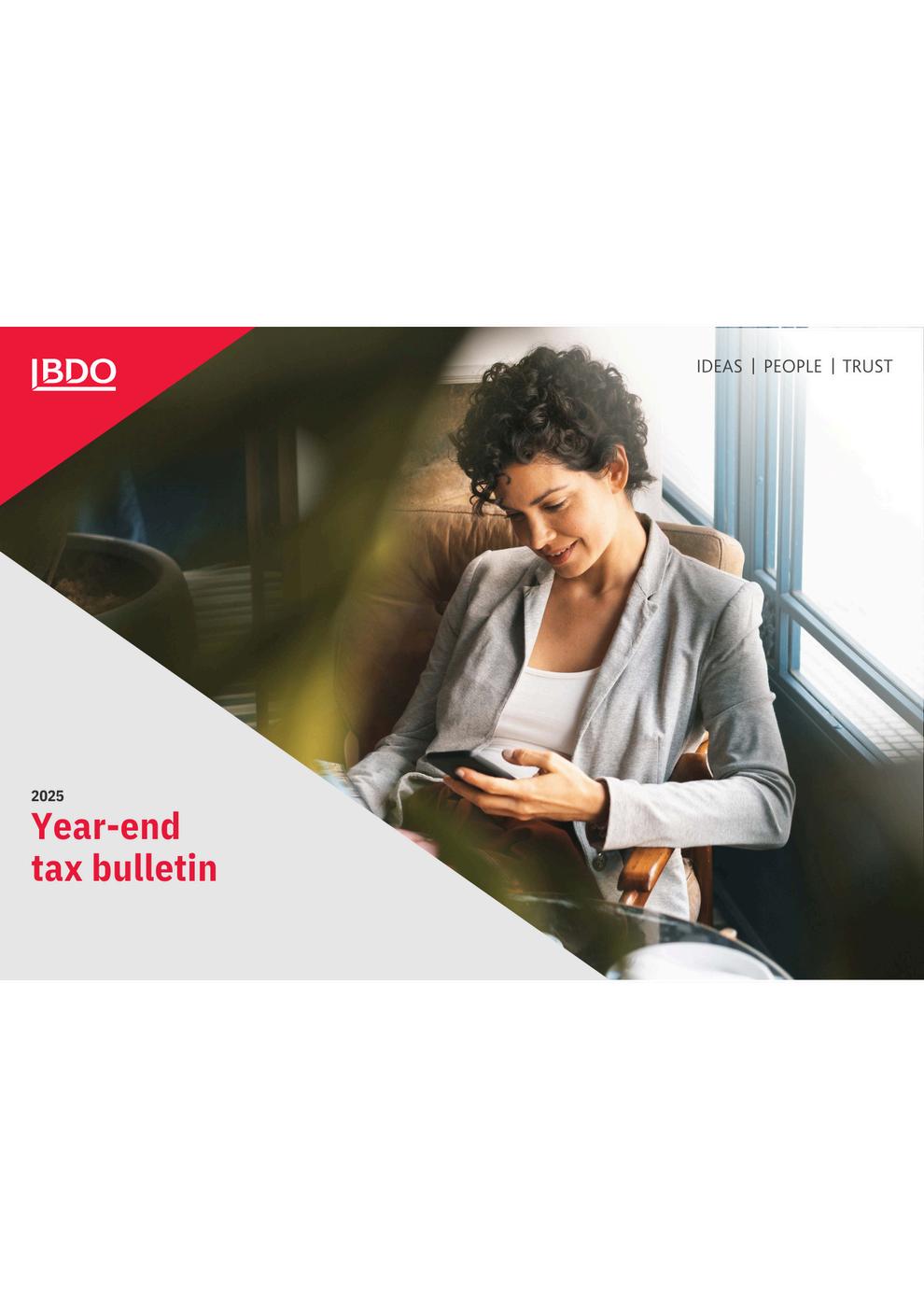 TheBDO2025Year-EndTaxBulletinprovidesanoutlinetohelpmanageyourcompulsory taxcomplianceandyear-endtaxliabilities,butpleasenotethisisnotcomprehensive. Beforeactingontheinformationprovided,youshouldconsideryourindividual circumstancesandconsultyourBDOtaxadvisertoreceivetailoredadvice.