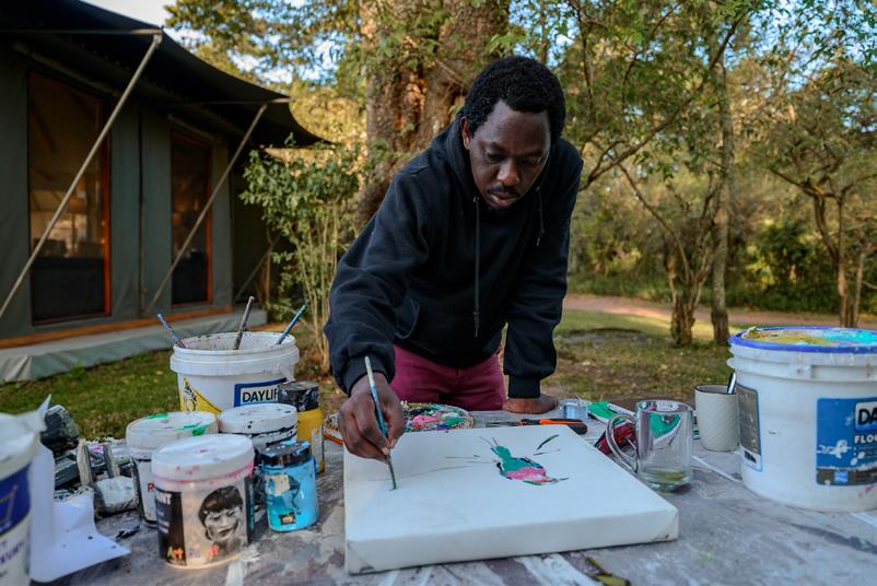 Promoting contemporary Kenyan artists is something we love to do at The Safari Collection. In 2023, we hosted renowned Kenyan artist Adiran Nduma at Sala’s Camp for a weeklong residency, in which guests were able to witness his wonderful wildlife creations come to life. We also hosted him at Giraffe Manor on World Giraffe Day, where his live giraffe portraits raised funds for our Footprint Trust. Many of his paintings adorn the walls of our camps and lodges, celebrating Kenyan culture and wildlife.