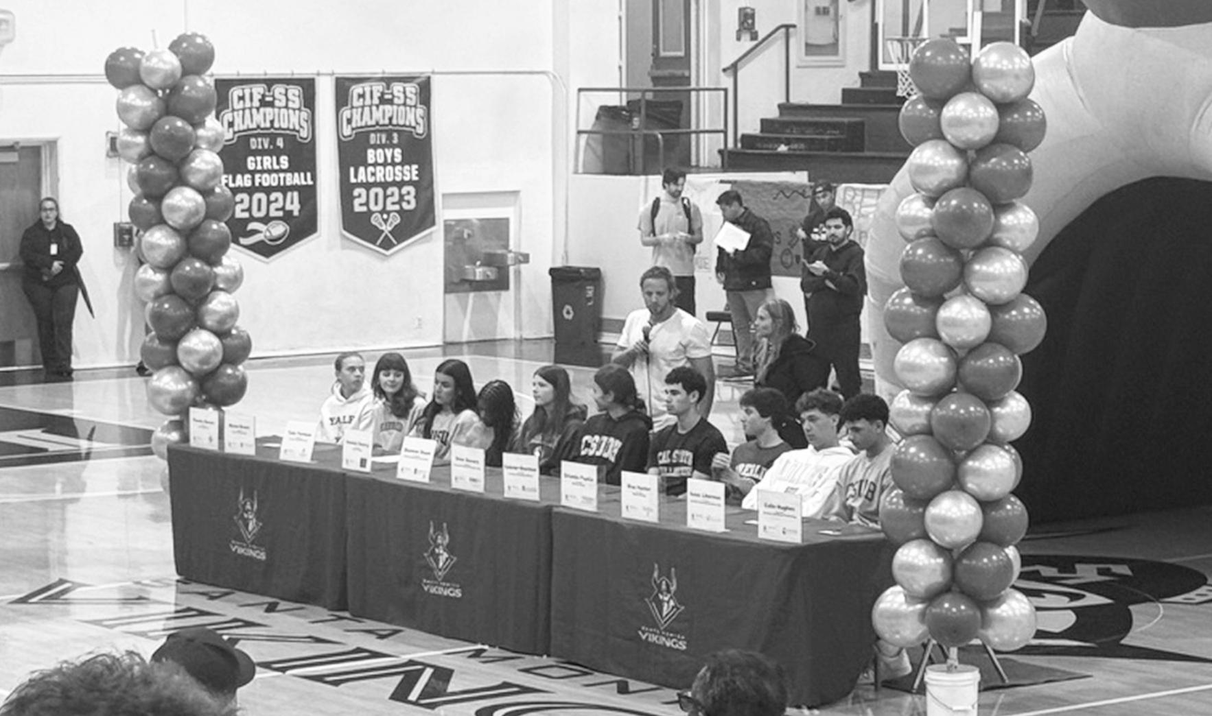[From left to right:] Seniors Phoebe Benun, Maren Bruce, Talia Yermian, Anada Searcy, Shannon Stuart, Drew Sievers, Gabriel Sherman, Orlando Popkin, Blue Hunter, Isaac Liberman, at Samo’s 2025 Signing Day ceremony on Feb. 5th in the North Gym. Colin Hughes and Daniela Petran not pictured.
