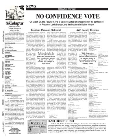 Gabriel Barreneche, Given the significance of recent Associate Professor of Spanish events, the A&S faculty would like to Sharon Carnahan, address the reasons and make clear Professor of Psychology the concerns prompting its vote of no Julian Chambliss, confidence in President Duncan. We Associate Professor of History must respectfully disagree with his Martha Cheng, view of affairs and stress the substanAssociate Professor of English Tom Cook, tive concerns we see linked to these Professor of Philosophy events. Don Davison, The president suggests that the Professor of Political Science Quality Enhancement Plan and DemJoan Davison, onstration of Learning Team repreProfessor of Political Science sent faculty consultation on curricular Philip Deaver, matters. But these initiatives simply Professor of English are not relevant, for they are linked Kimberly Dennis, Associate Professor of to accreditation Art History While the president requirements of Edge, the Southern Asacknowledges institutional Hoyt Hugh F. and Jeanette sociation of ColG. McKean Chair of Phileges and Schools planning, he fails to address losophy his repeated pattern of (SACS) and are Lynda Glennon, part of an ongoing ignoring faculty, staff, and Professor of Sociology institutional proDana Hargrove, student efforts in favor of Associate Professor of cess begun before Art arbitrary action. the president’s Paul Harris, tenure and unconProfessor of Psychology nected to the conPhilip Kozel, cerns prompting the faculty’s vote. Associate Professor of Economics A vote of no confidence is a blunt Harry Kypraios, message linked to the president’s acProfessor of Economics tions. In passing this resolution the Tom Lairson, Ronald G. and N. Jayne Gelbman Chair of Interfaculty has acted in good faith to voice national Business its concern about his pattern of trouBarry Levis, bling decision-making, which is more Professor of History informed by trends than by reasoned Susan Libby, examination of our institution’s history, Professor of Art History strengths, and identity. As noted in Lee Lines, our resolution, the president’s lack of Professor of Environmental Studies communication and reluctance to enJennifer Queen, Associate Professor of Psychology gage the faculty on significant curricuL. Ryan Musgrave, lar matters is driving these concerns. Associate Professor of Philosophy While the president acknowledges Robert Moore, institutional planning, he fails to adProfessor of Anthropology dress his repeated pattern of ignoring Maurice O’Sullivan, faculty, staff, and student efforts in faKenneth Curry Chair in Literature, Professor of vor of arbitrary action. Faced with no English clear path to create unity of purpose, Charles Rock, Professor of Economics the faculty acted in good faith to voice Ed Royce, its concerns to the Board of Trustees. Professor of Sociology The faculty recognizes the challenges Eric Schultz, facing higher education, and it is actProfessor of Economics ing in the hope that Rollins will be able Rachel Simmons, to face these challenges as a strong Professor of Art and united community. Bruce Stephenson, Signed, Professor of Environmental Studies Vidhu Aggarwal, Associate Professor of English Barry Allen, Professor of Environmental Studies Pedro Bernal, Professor of Chemistry Wendy Brandon, Professor of Education Alexander Boguslawski, Professor of Russian Dexter Boniface, Weddell Chair of the Americas and Associate Professor of Political Science