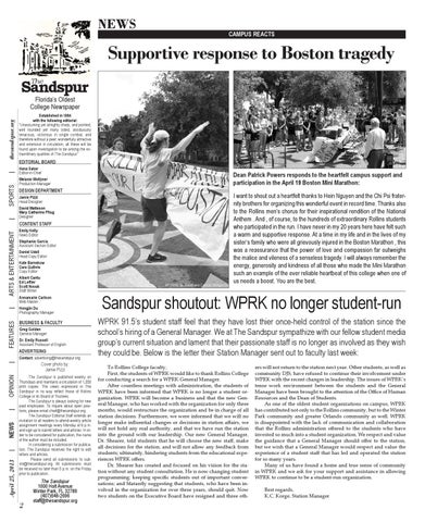 Sandspur shoutout: WPRK no longer student-run WPRK 91.5’s student staff feel that they have lost thier once-held control of the station since the school’s hiring of a General Manager. We at The Sandspur sympathize with our fellow student media group’s current situation and lament that their passionate staff is no longer as involved as they wish they could be. Below is the letter their Station Manager sent out to faculty last week: To Rollins College faculty, First, the students of WPRK would like to thank Rollins College for conducting a search for a WPRK General Manager. After countless meetings with administration, the students of WPRK have been informed that WPRK is no longer a student organization. WPRK will become a business and that the new General Manager, who has worked with the organization for only three months, would restructure the organization and be in charge of all station decisions. Furthermore, we were informed that we will no longer make influential changes or decisions in station affairs, we will not hold any real authority, and that we have run the station into the ground with our leadership. Our new General Manager, Dr. Shearer, told students that he will choose the new staff, make all decisions for the station, and will not allow any feedback from students; ultimately, hindering students from the educational experiences WPRK offers. Dr. Shearer has created and focused on his vision for the station without any student consultation. He is now changing student programming; keeping specific students out of important conversations; and blatantly suggesting that students, who have been involved in the organization for over three years, should quit. Now two students on the Executive Board have resigned and three oth-